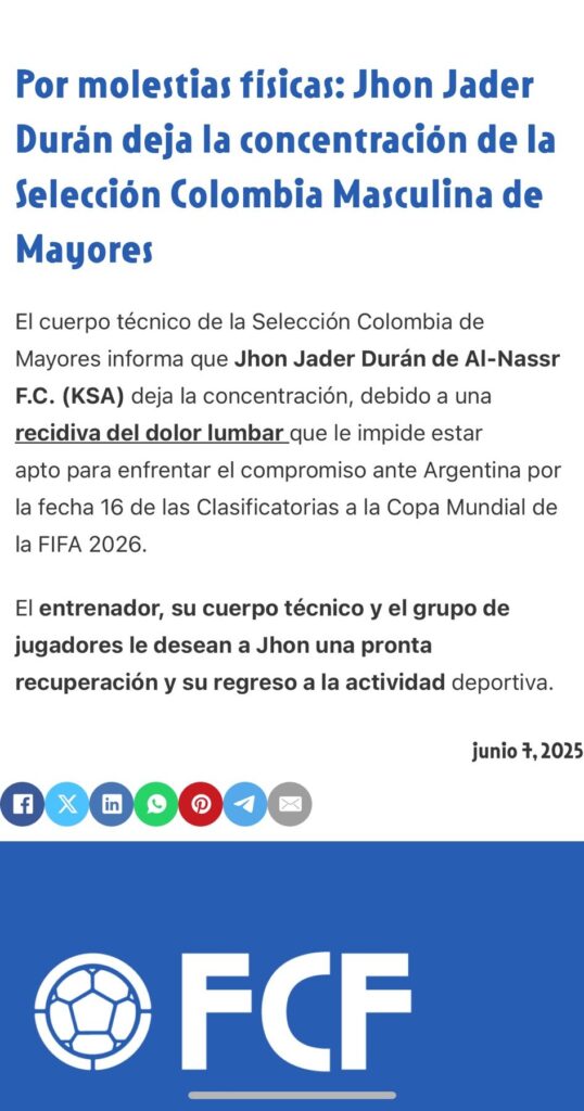 La noticia que este viernes 7 de junio sacude a la Selección Colombia no tomó por sorpresa a los lectores de nuestro medio. Tal como lo anticipamos ayer, Jhon Jáder Durán fue desconvocado del equipo nacional. La versión oficial habla de molestias físicas, pero todo apunta a que la verdadera razón fue un altercado en camerinos.