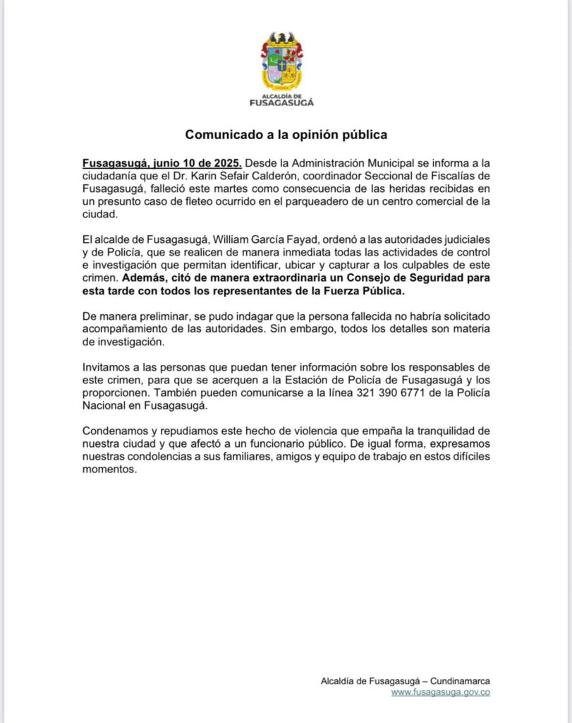 Fusagasugá, Cundinamarca, vivió una jornada trágica el lunes 10 de junio de 2025. El coordinador seccional de fiscalías en el departamento, Karin Sefair Calderón, fue asesinado a plena luz del día tras retirar una millonaria suma de dinero de una entidad bancaria. El hecho se registró en inmediaciones de un centro comercial.