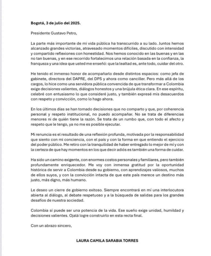 En su carta de renuncia, Laura Sarabia manifestó que no comparte “decisiones tomadas en los últimos días” y que su salida responde a un acto de coherencia personal e institucional. La decisión fue calificada como irreversible y tomada sin ánimo de generar conflicto, pero el mensaje fue claro: ya no se sentía cómoda ni respaldada en el gobierno.