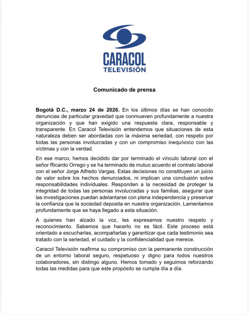 Caracol Televisi贸n confirm贸 de manera oficial la salida de Ricardo Orrego y Jorge Alfredo Vargas a trav茅s de un comunicado emitido el 24 de marzo de 2026.
